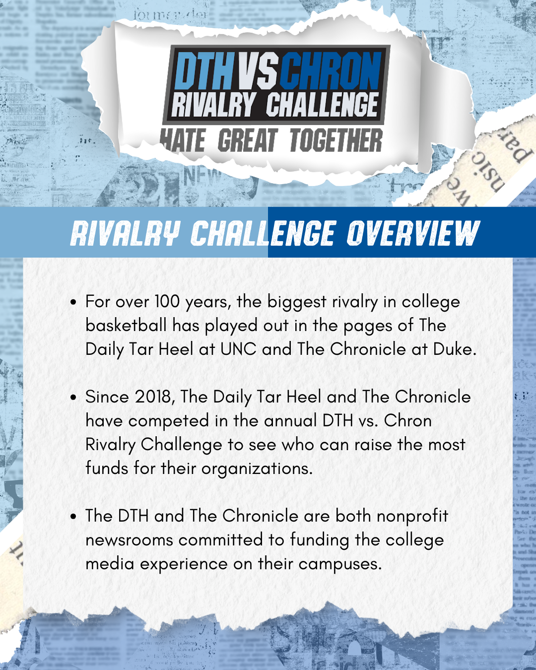 Helped create engaging video and graphic design content for The Daily Tar Heel’s social media pages during the DTH vs. Chronicle Rivalry Challenge to help promote fundraising efforts for the DTH. Since 2018, The Daily Tar Heel and The Chronicle have competed in the annual Rivalry Challenge during the week leading up to the UNC vs. Duke basketball game.