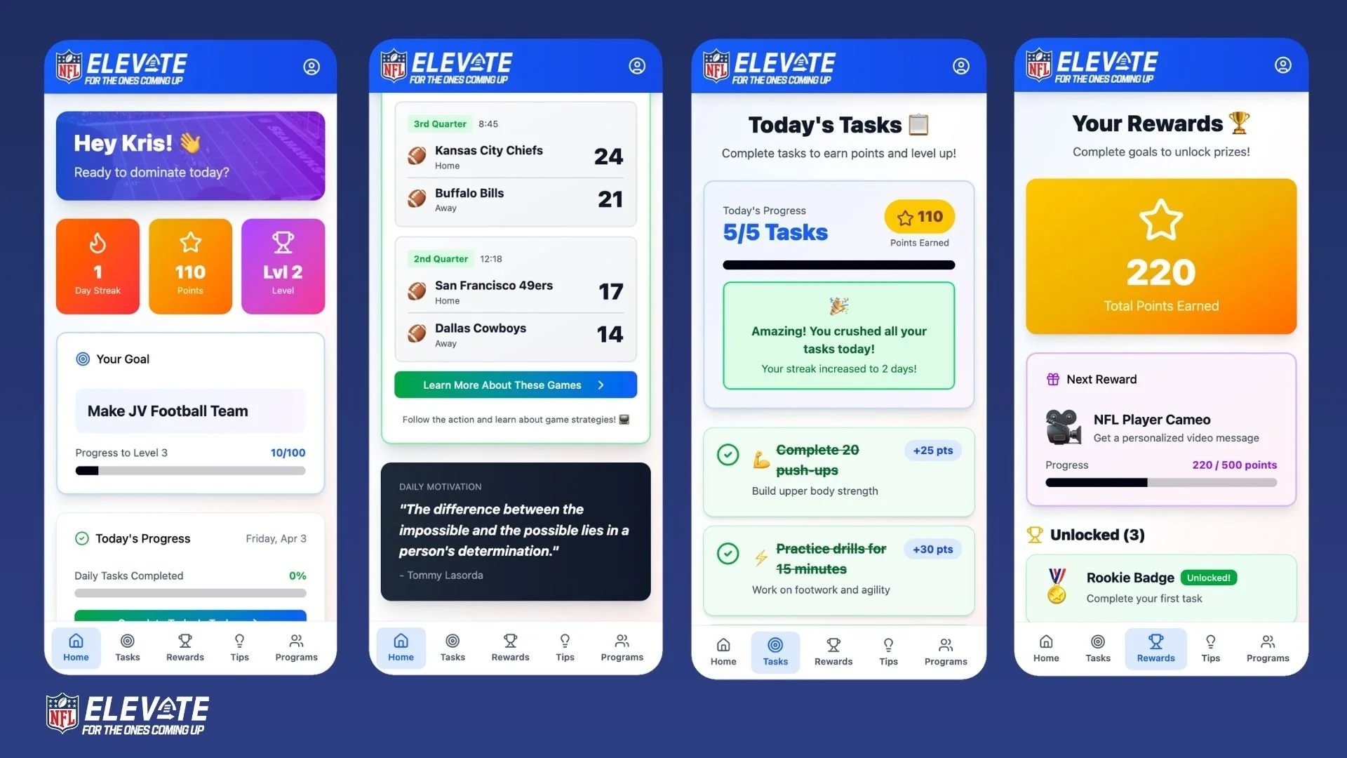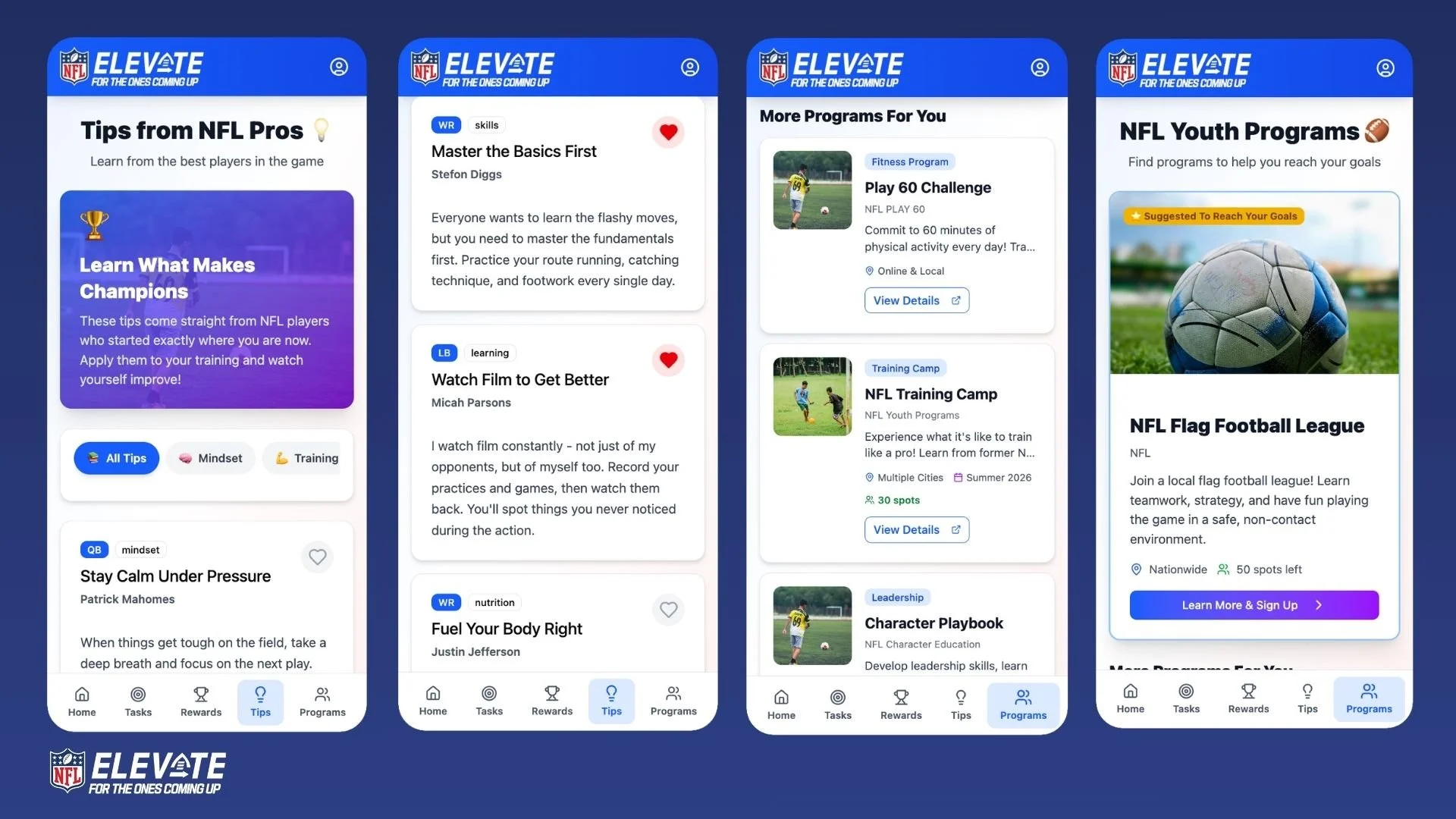 The NFL Elevate App gives youth a place to start by setting goals, tracking progress, and using NFL initiatives as tools to help them achieve and maintain those goals.
