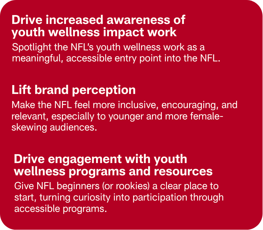 The NFL Elevate website will showcase all of the NFL’s youth health and wellness initiatives under a single umbrella. So when Rookies do see our video, social, activations, and out-of-home, and want to find their start, they’ll be able to find the initiative for them.