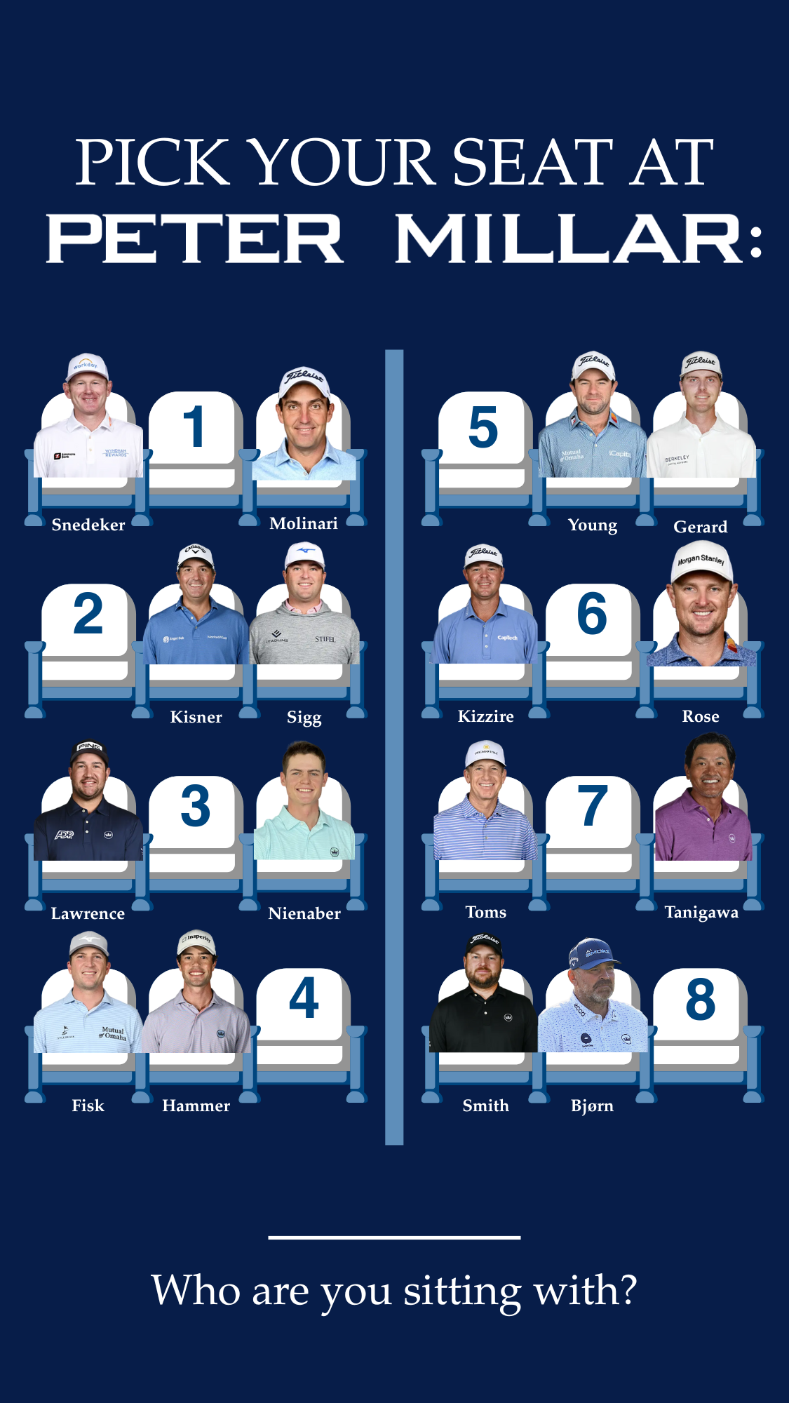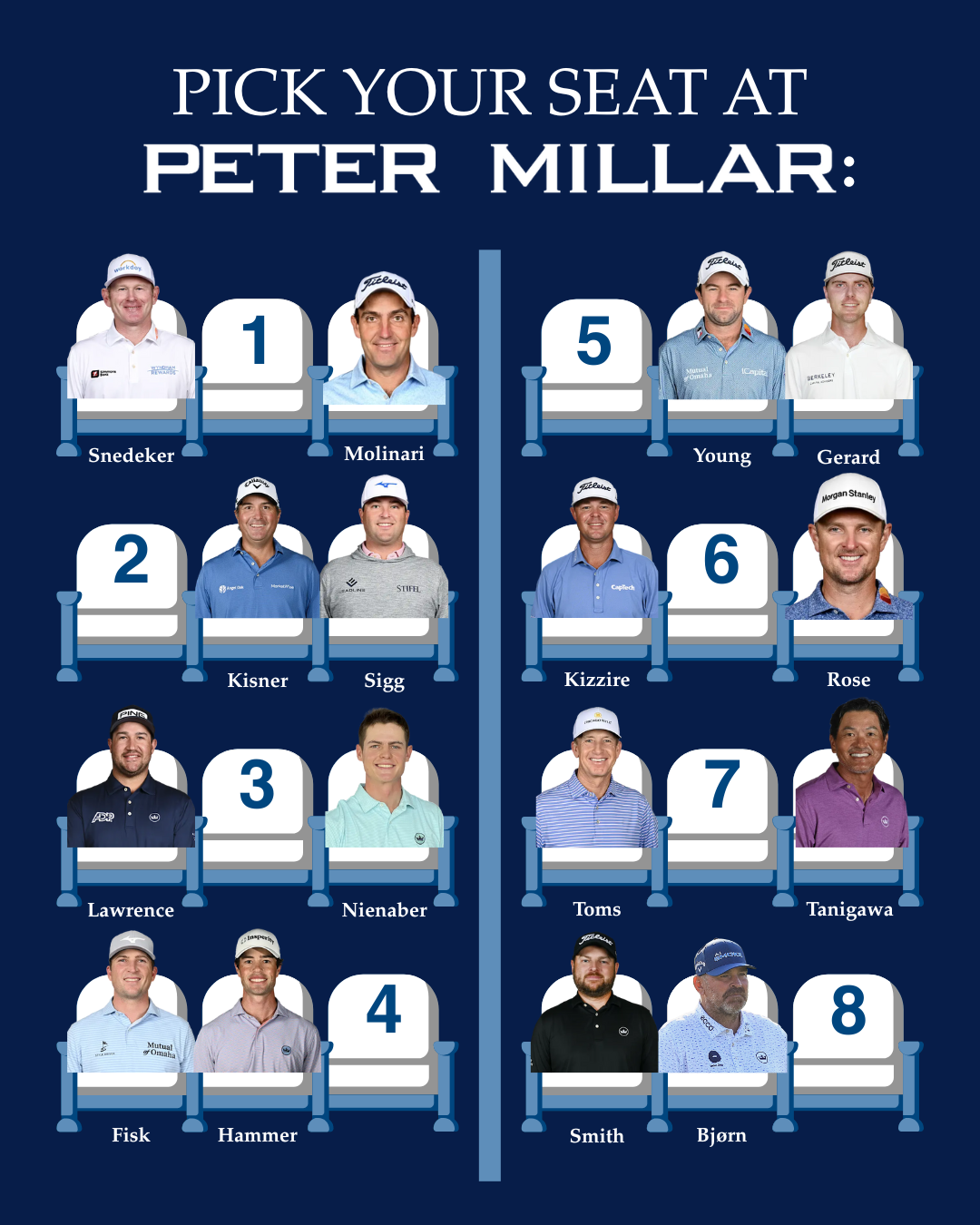 Roll: Design Peter Millar seating chart graphics with notable Peter Millar-sponsored golfers playing in the Wyndham Tournament. Film and edit a TikTok at the Wyndham Tournament, asking attendees and players where they would sit on the Peter Millar seating chart